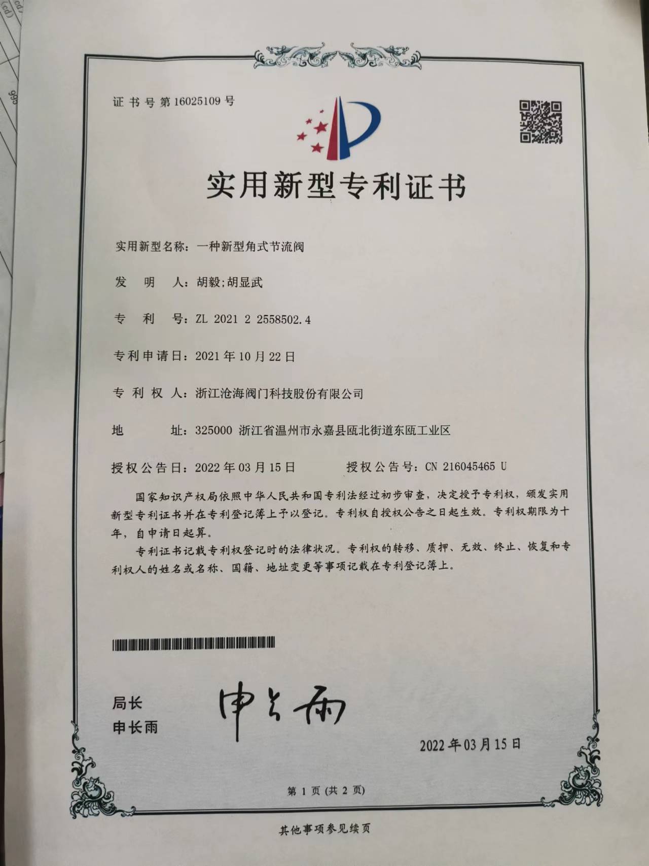 CHVJ滄海高壓角式節(jié)流閥專利證書
